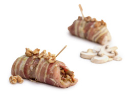 Filetlapje gevuld met champignons, uitje, walnoten en pesto omwikkeld met rookspek.